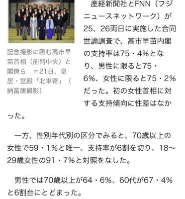 しかし、実際の数字で見てみると高市さんの男女別の支持率はほぼ同等なので、女性が敵とは言えないみたい。
