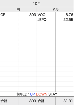 いつものごとく10月は寂しい配当となっておりますが、毎月分配のJEPQがいい仕事をしてくれています。
