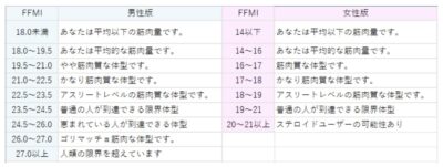 FFMIは女性の場合14〜16が平均値とのことなので、ギリ平均値だけどアラフォーにしては少なすぎるよなと・・・汗