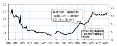 1890年代後半に離婚率がいきなり激減していますが、これは「家制度」という法律が始まったからみたい。
