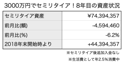 ※こちらは独身時代に貯めた3000万円のセミリタイア資金のみの数字のため、それ以外の資産(iDeCoなど老後資金、子供&車資金、その他余剰資金、夫の個人資産)は含まれておりません